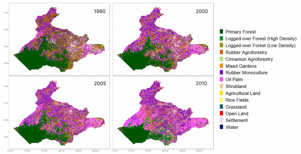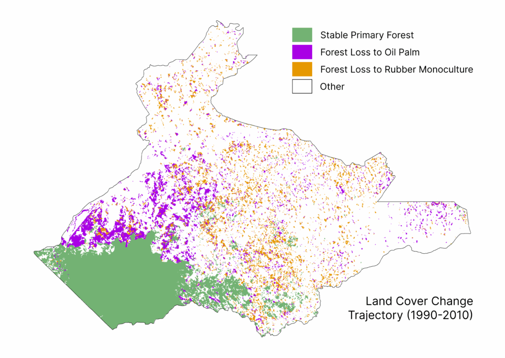 Namun, sebenarnya perubahan apa yang menjadi faktor utama hilangnya hutan primer di Kabupaten Bungo? Jawaban atas pertanyaan ini sama pentingnya dengan analisis tentang laju perubahan tutupan lahan. Jika dilihat secara historis, pada tahun 1990, jenis tutupan lahan yang mendominasi di Kabupaten Bungo terdiri dari hutan primer, karet (monokultur dan agroforestri), serta perkebunan kelapa sawit. Komposisi tutupan lahan tersebut terus bertahan hingga 2010, di mana tutupan lahan perkebunan untuk komoditas kelapa sawit meningkat 2,5 kali lipat, dari 41,840 ha menjadi 107,264 ha. Sama halnya dengan komoditas perkebunan karet yang mengalami peningkatan luas 63% menjadi 132,979 ha. Terjadi perubahan tren perkebunan karet dari sistem agroforestri menjadi monokultur pada pada tahun 2010.