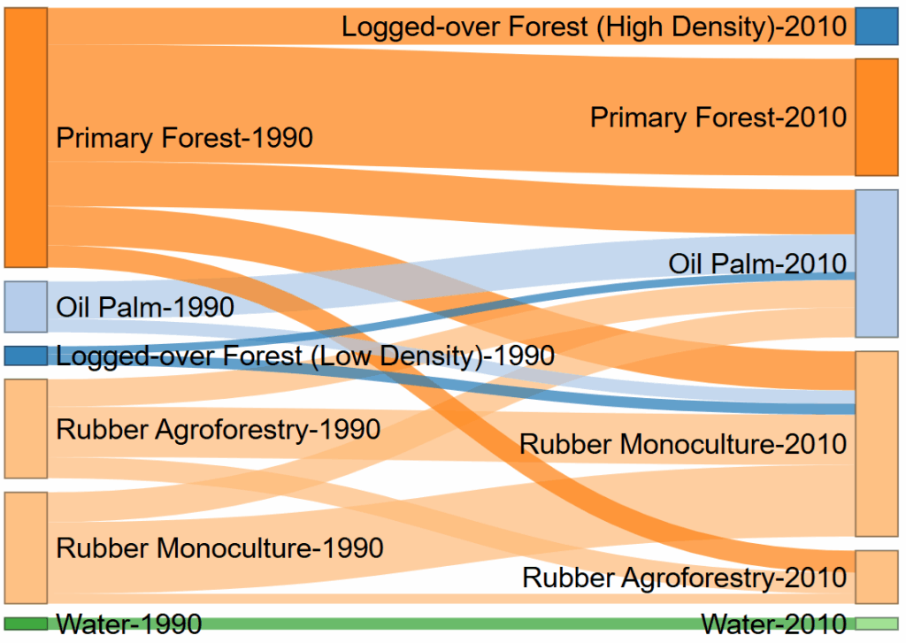 Aliran perubahan tutupan lahan secara lebih jelas dapat dilihat pada Gambar 3 yang menunjukkan tipe konversi apa saja yang terjadi pada sejumlah kelas tutupan lahan. Perkebunan kelapa sawit pada tahun 2010 terbentuk dari pembukaan hutan primer, hutan sekunder, dan perkebunan karet. Sama halnya dengan perkebunan karet monokultur yang dominan disumbang oleh pembukaan hutan primer dan konversi lahan karet agroforestri.