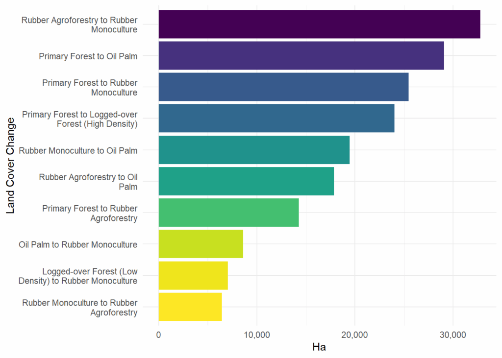 Untuk melihat jenis perubahan tutupan lahan apa yang terjadi pada hutan primer Bungo, LUMENS melalui modul Pre-QuES dapat memfasilitasi kita untuk mengetahuinya. Hasil analisis Pre-QuES pada Gambar 2 menunjukkan dalam kurun waktu 20 tahun, jenis perubahan tutupan lahan terbesar berasal konversi lahan agroforestri karet menjadi karet monokultur, diikuti dengan deforestasi pada hutan primer untuk perkebunan kelapa sawit di urutan kedua sebesar 29,095 ha dan pembukaan hutan primer untuk karet monokultur pada urutan ketiga sebesar 25,484 ha.